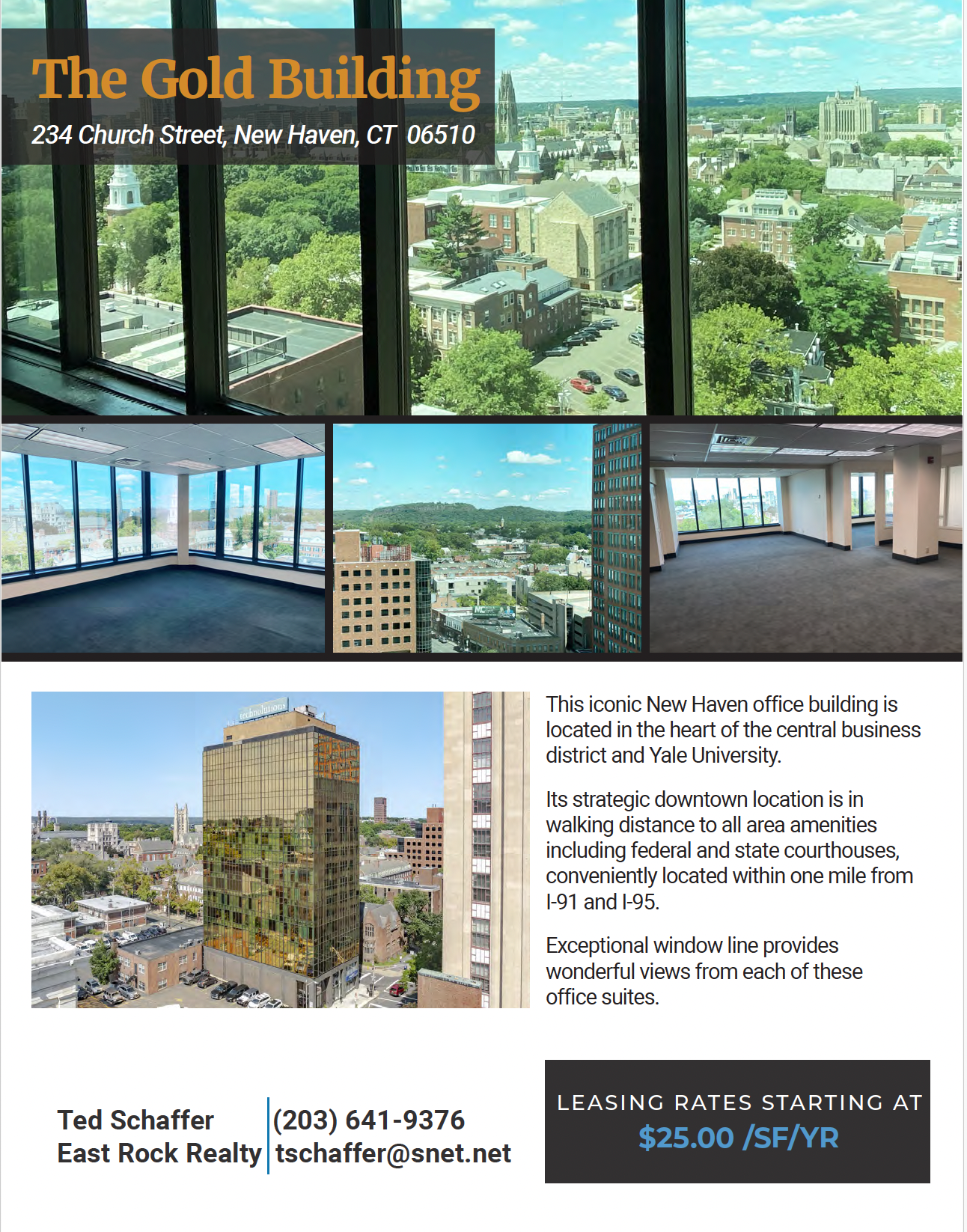 This iconic New Haven office building is located in the heart of the central business district and Yale University. Its strategic downtown location is in walking distance to all area amenities including federal and state courthouses, conveniently located within one mile from I-91 and I-95. Exceptional window line provides wonderful views from each of these office suites.