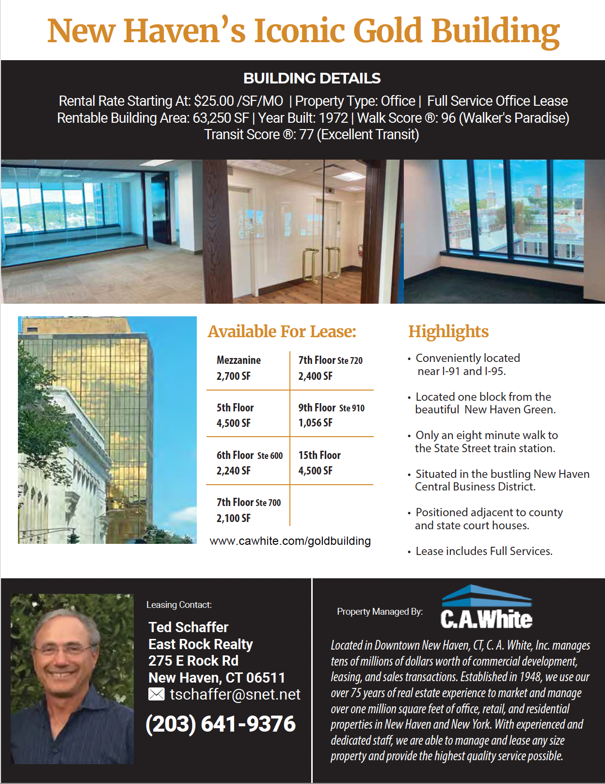 C.A. White, Inc. is a full-service real estate firm based in Downtown New Haven. Founded in 1950, we possess over sixty-five years of real estate experience, which includes the management of a portfolio of apartment buildings in New Haven, many near Yale, and tens of millions of dollars’ worth of commercial transactions.